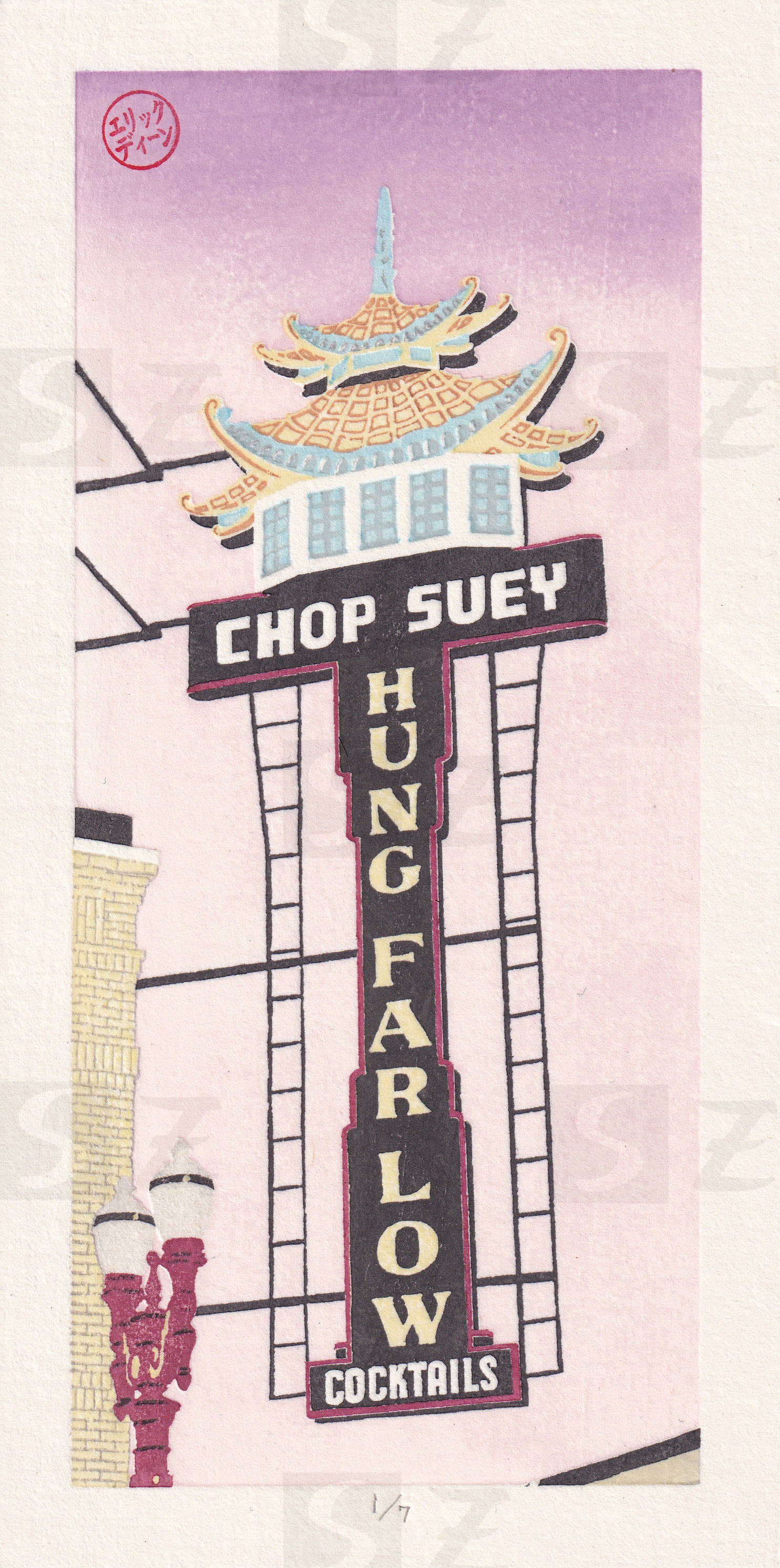 Hung Far Low sign – This mokuhanga print depicts the Hung Far Low restaurant sign in Old Town, Portland, Oregon. Edition of 7, signed (hanko), unframed. 100% of profits to the Portland Chinatown Museum.