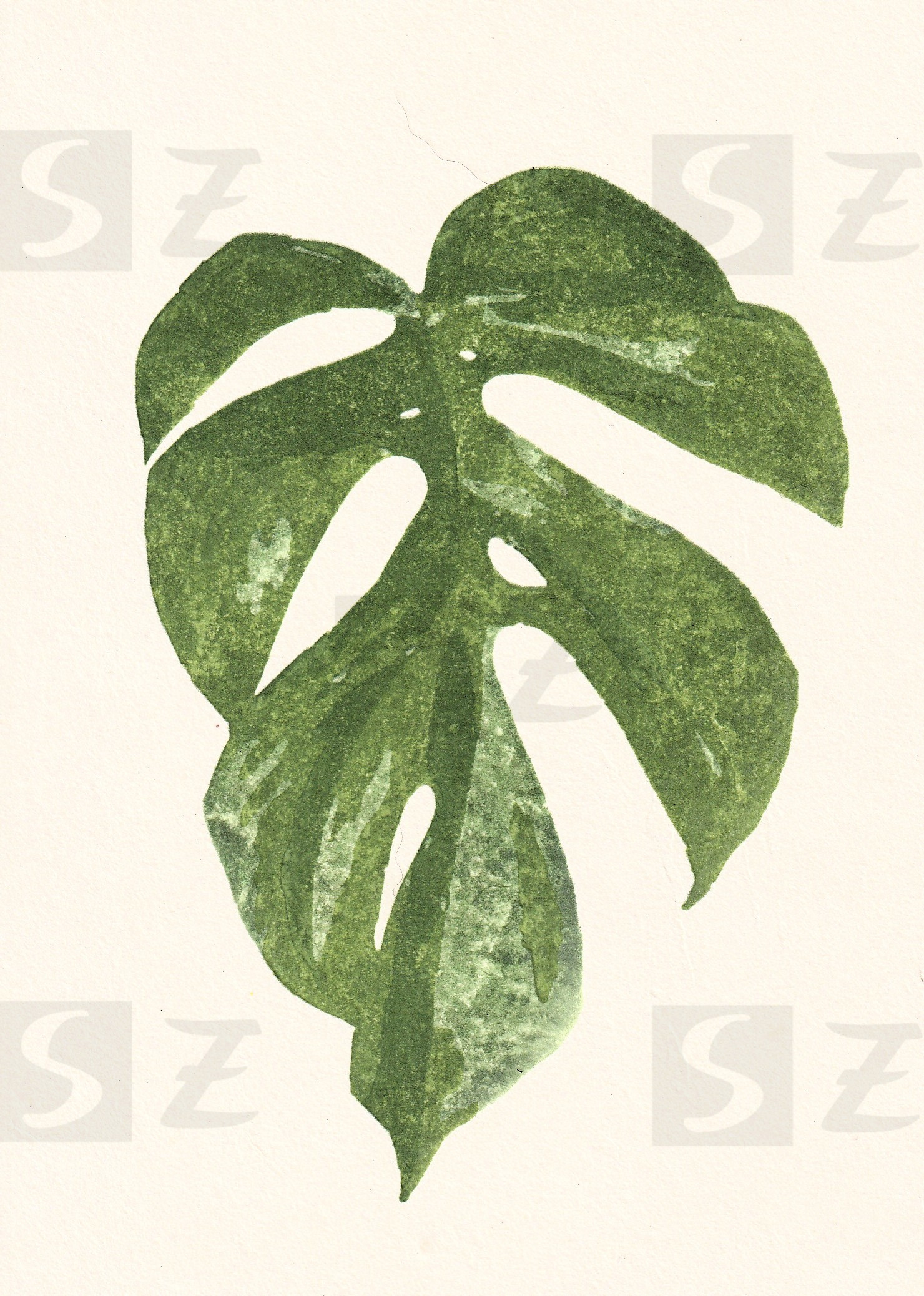 Mini-monstera. Mokuhanga print depicts a mini-monstera leaf. Open edition, not signed. 10% of profits to the Mokuhanga Project Space.