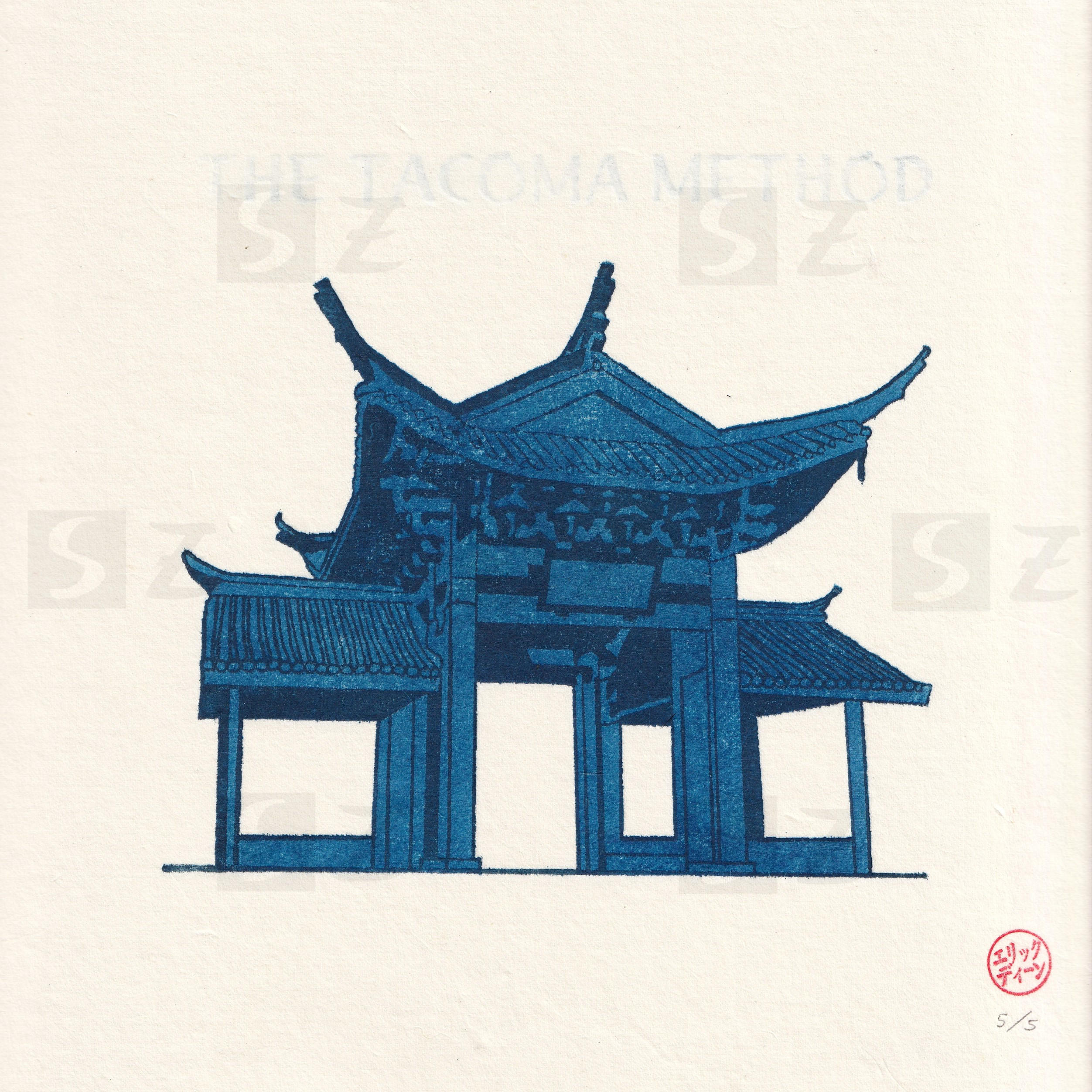 The Tacoma Method (blue) - Depiction of Fuzhou Ting in Chinese Reconciliation Park, Tacoma, Washington. 10” x 10”. Signed (hanko), edition of 5. 100% of profits to the Chinese Reconciliation Project.