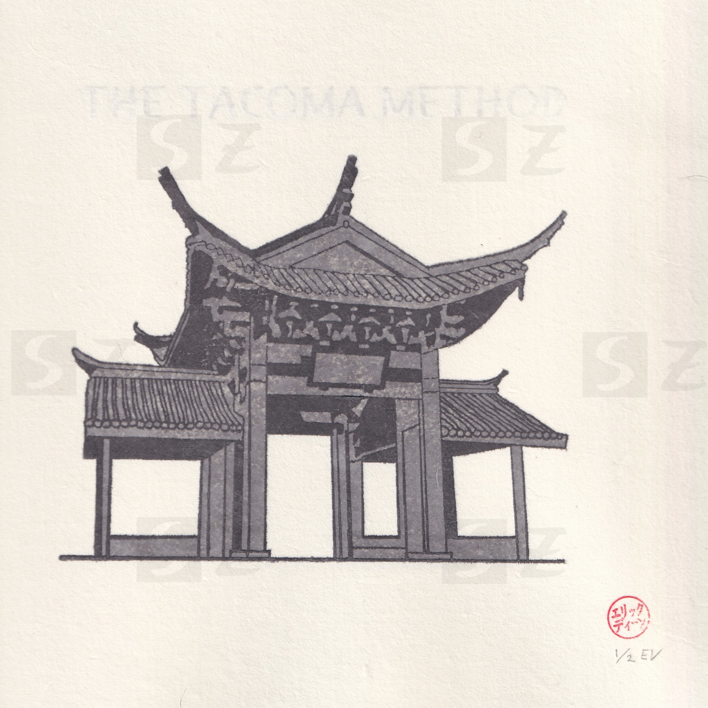 The Tacoma Method (gray) - Depiction of Fuzhou Ting in Chinese Reconciliation Park, Tacoma, Washington. 10” x 10”. Signed (hanko), edition of 2. 100% of profits to the Chinese Reconciliation Project.