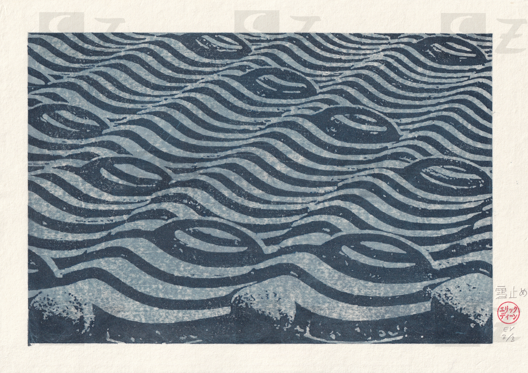 雪止め (yukidome) – Depiction of roof tiles with snow blockers in Echizen, Japan. 8.27” x 11.69”. Signed (hanko), variable edition of 3. 10% of profits to Mokuhanga Project Space.
